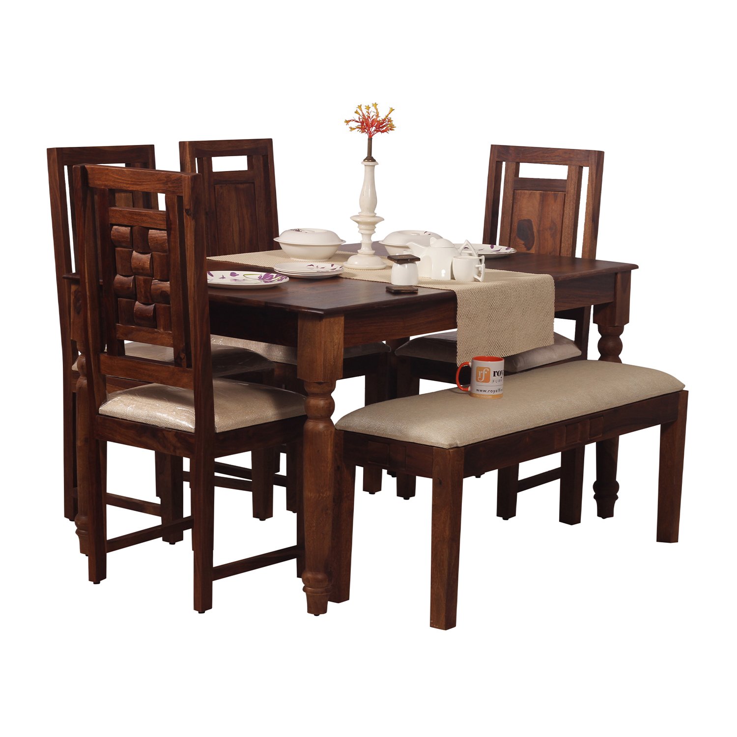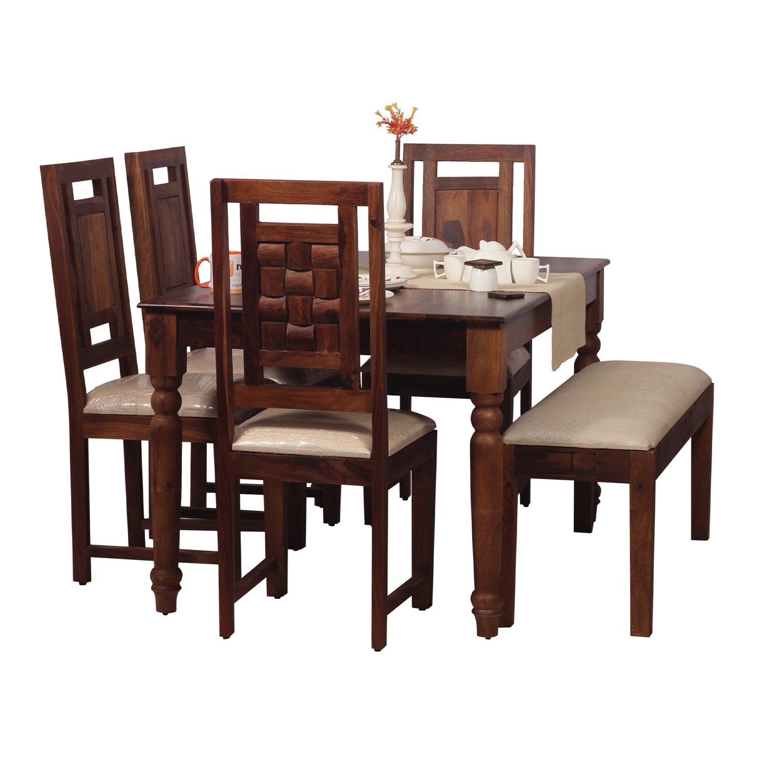 - 4 Seater & 1 Bench Dining Table Size: Length – 35 IN(90 CM) ,Width – 57 IN(145 CM) , Height – 30 IN(76 CM), Top Width:1 IN(2.5 CM), Ground Clearance:26 IN(66 CM)Chair Number & Dimensions: No of Chair: 4(For 4 Seater & 1 bench) , Length – 17.5 IN(44.5 CM), Width – 17.5 IN(44.5 CM), Height – 42 IN(105 CM),Bench: Length – 45 IN(115 CM), Width – 16 IN(40 CM), Height – 18 IN(46 CM),Ground Clearance: 14 IN(35.5 CM)