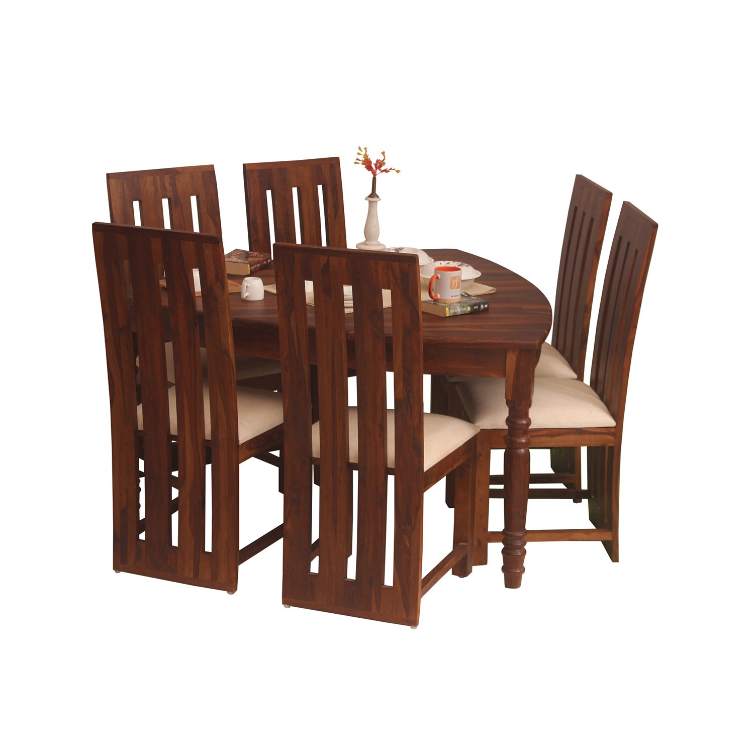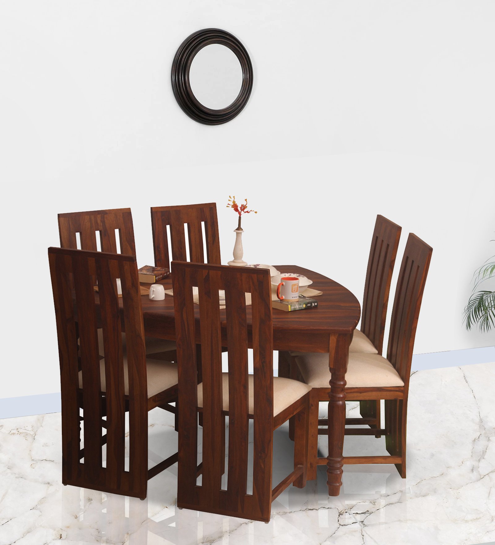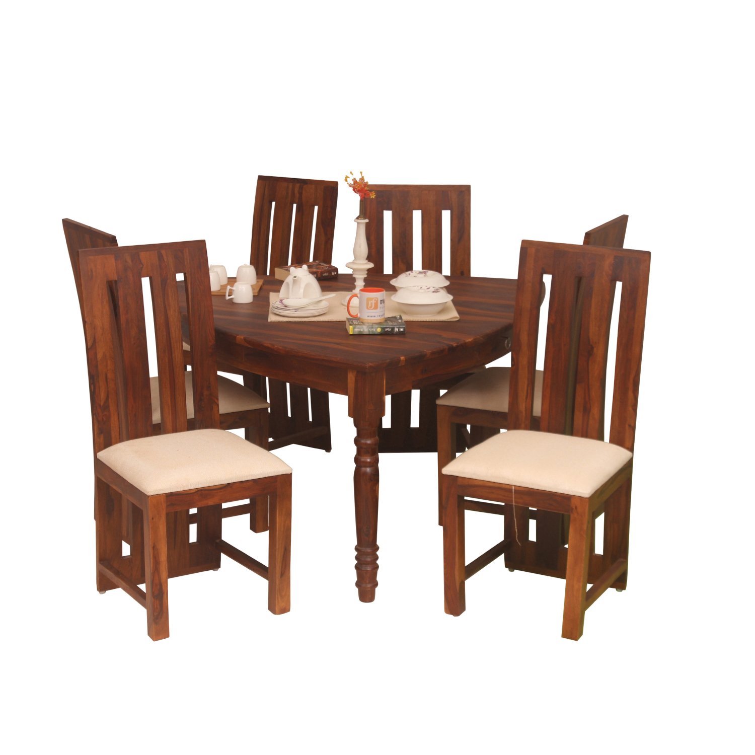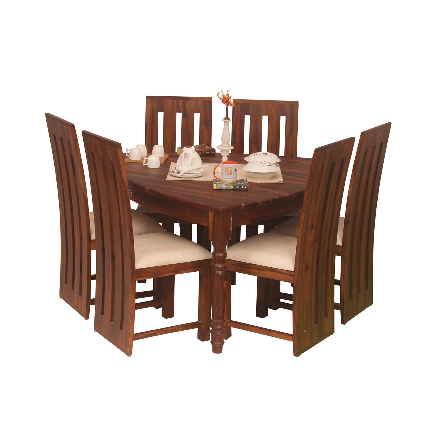 • 6 Seater  Dining Table Size: Length – Length – 53.5 IN(136 CM) ,Width – 57 IN(145 CM) , Height – 30 IN(76 CM), Top Width:1 IN(2.5 CM), Ground Clearance:26 IN(66 CM)Chair Number & Dimensions: No of Chair: 6(For 6 Seater ) , Length – 17.5 IN(44.5 CM), Width – 17.5 IN(44.5 CM), Height – 42 IN(105 CM)