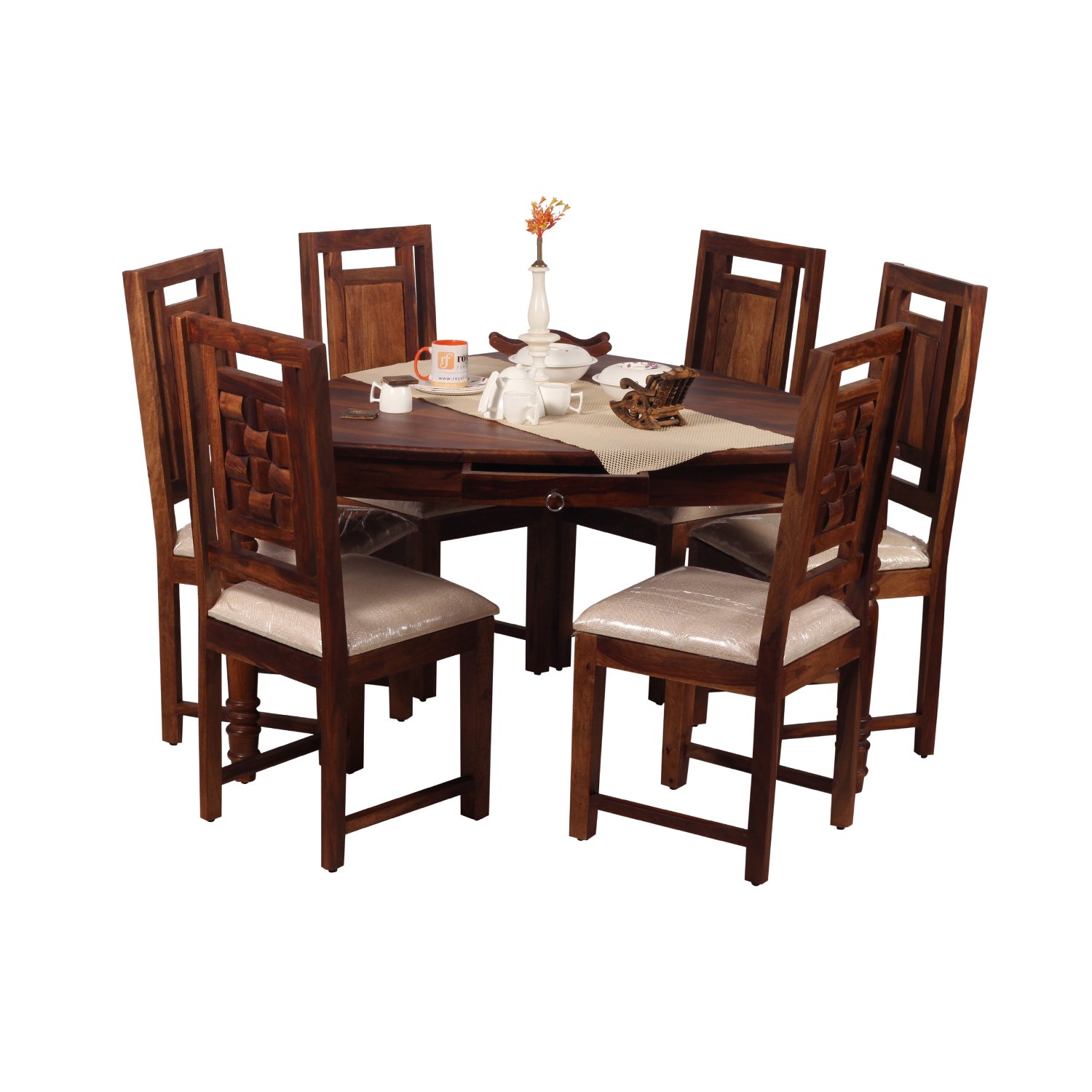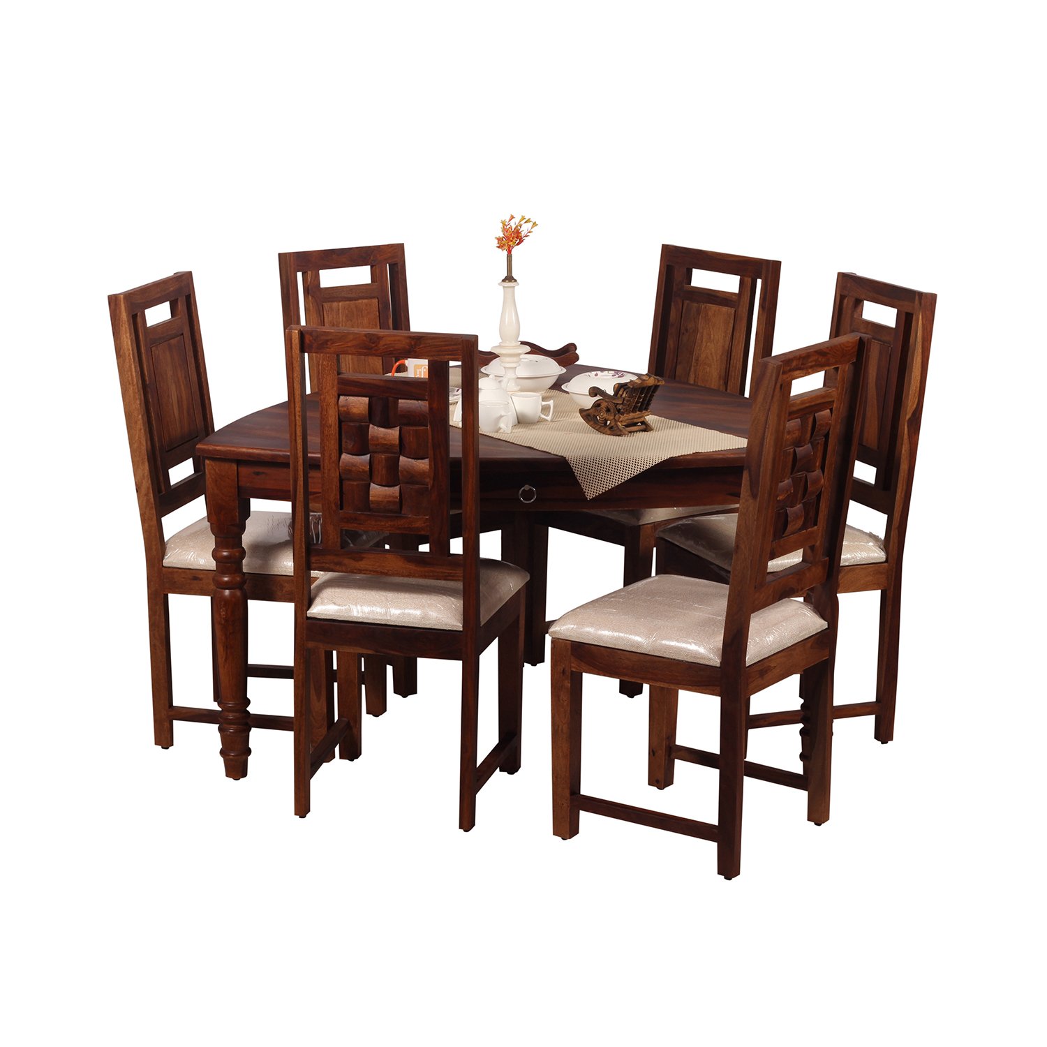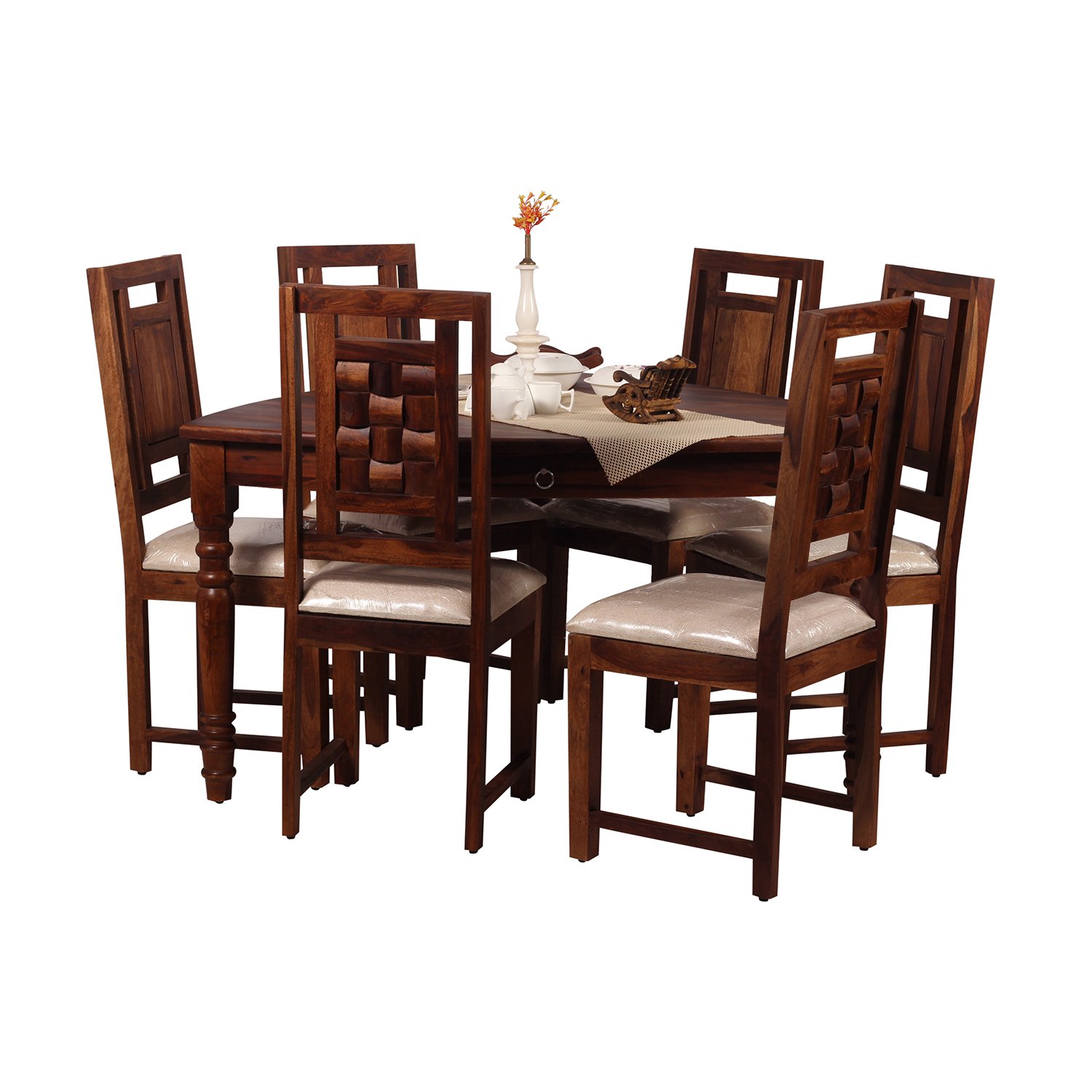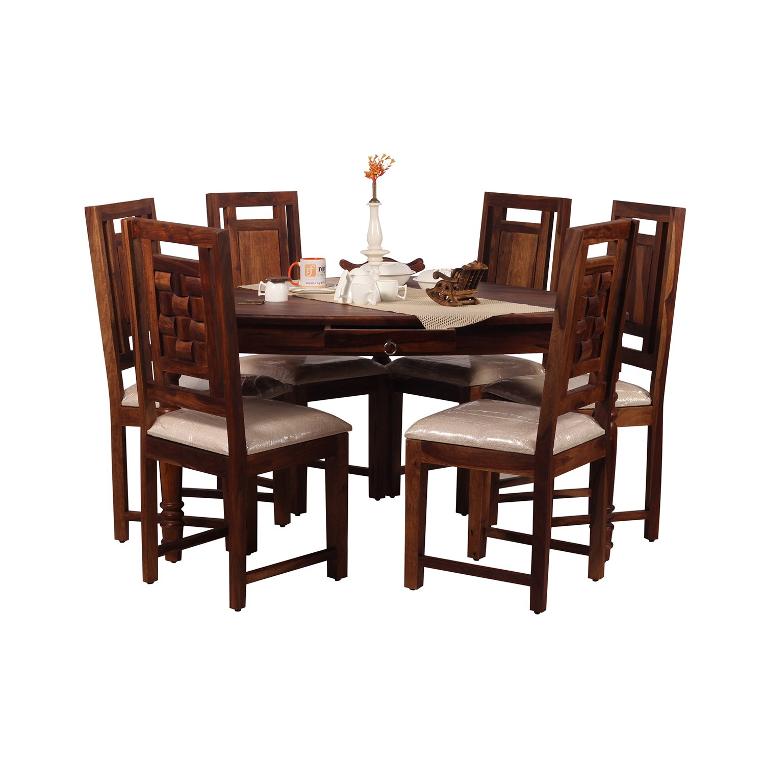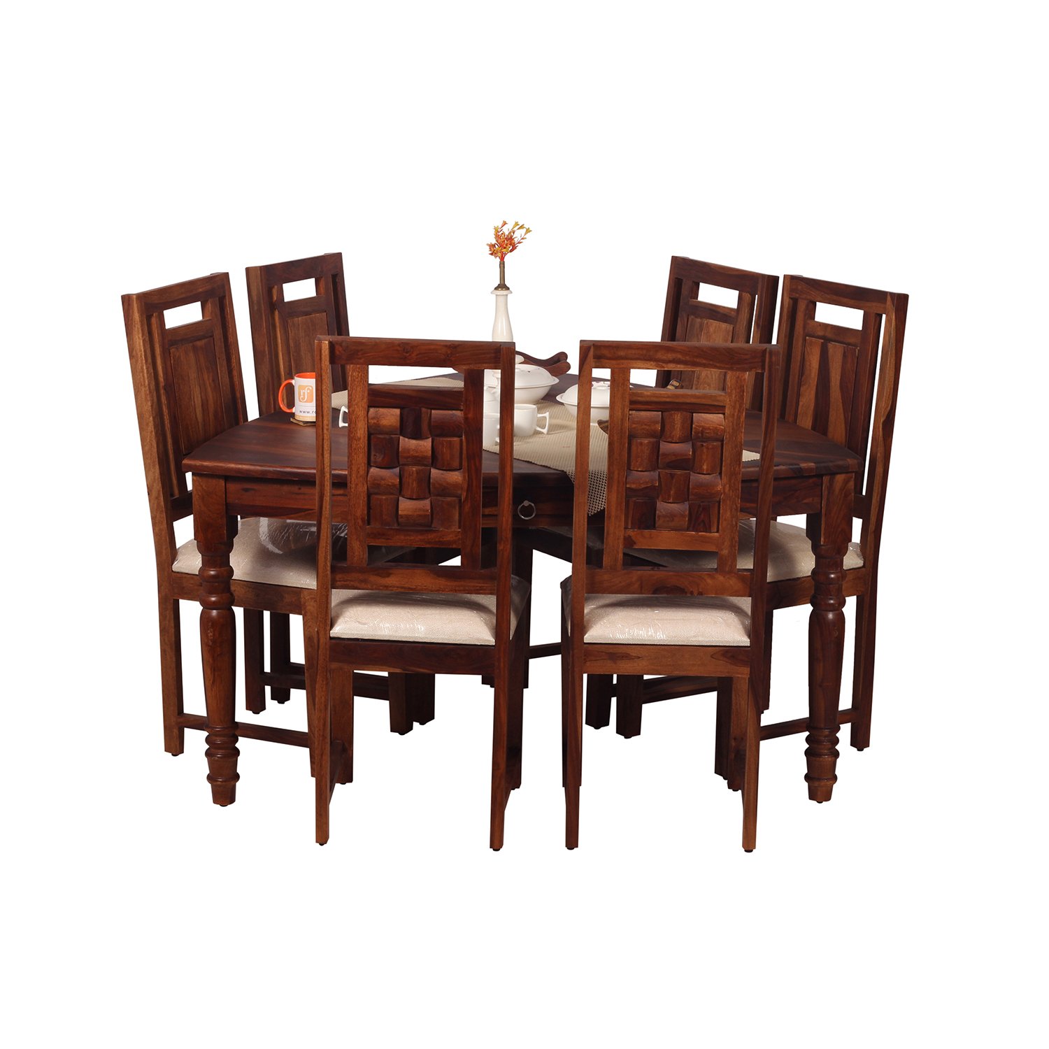 - 6 Seater Dining Table Size: Length – Length – 53.5 IN(136 CM) ,Width – 57 IN(145 CM) , Height – 30 IN(76 CM), Top Width:1 IN(2.5 CM), Ground Clearance:26 IN(66 CM)Chair Number & Dimensions: No of Chair: 6(For 6 Seater ) , Length – 17.5 IN(44.5 CM), Width – 17.5 IN(44.5 CM), Height – 42 IN(105 CM)