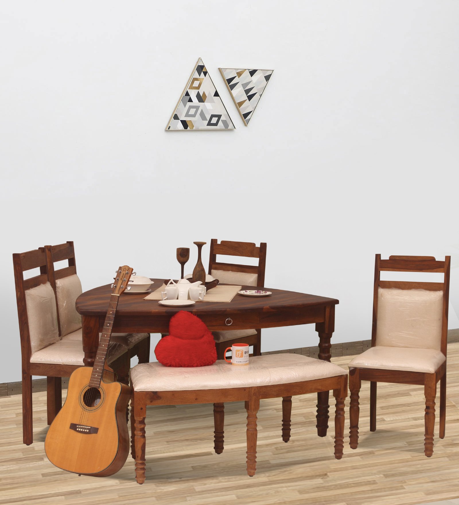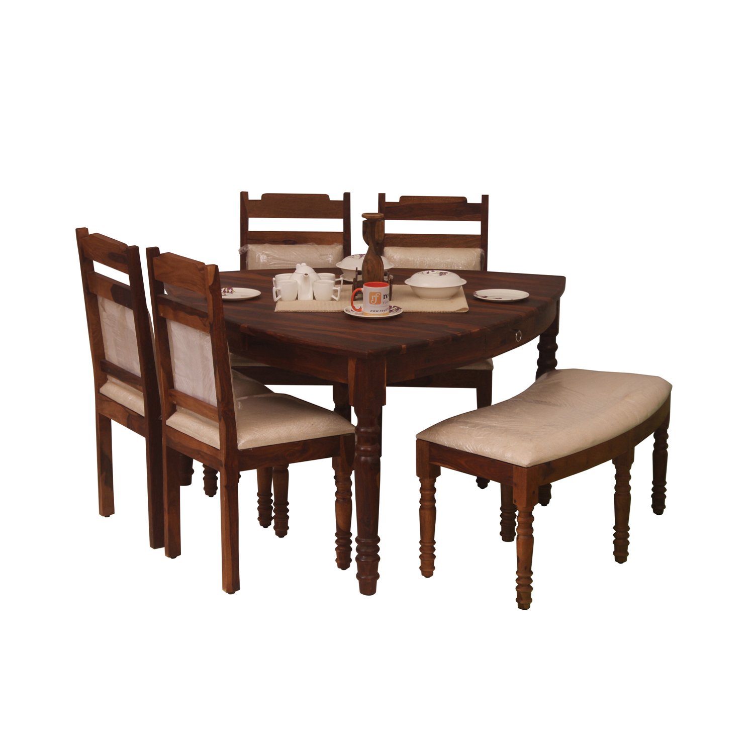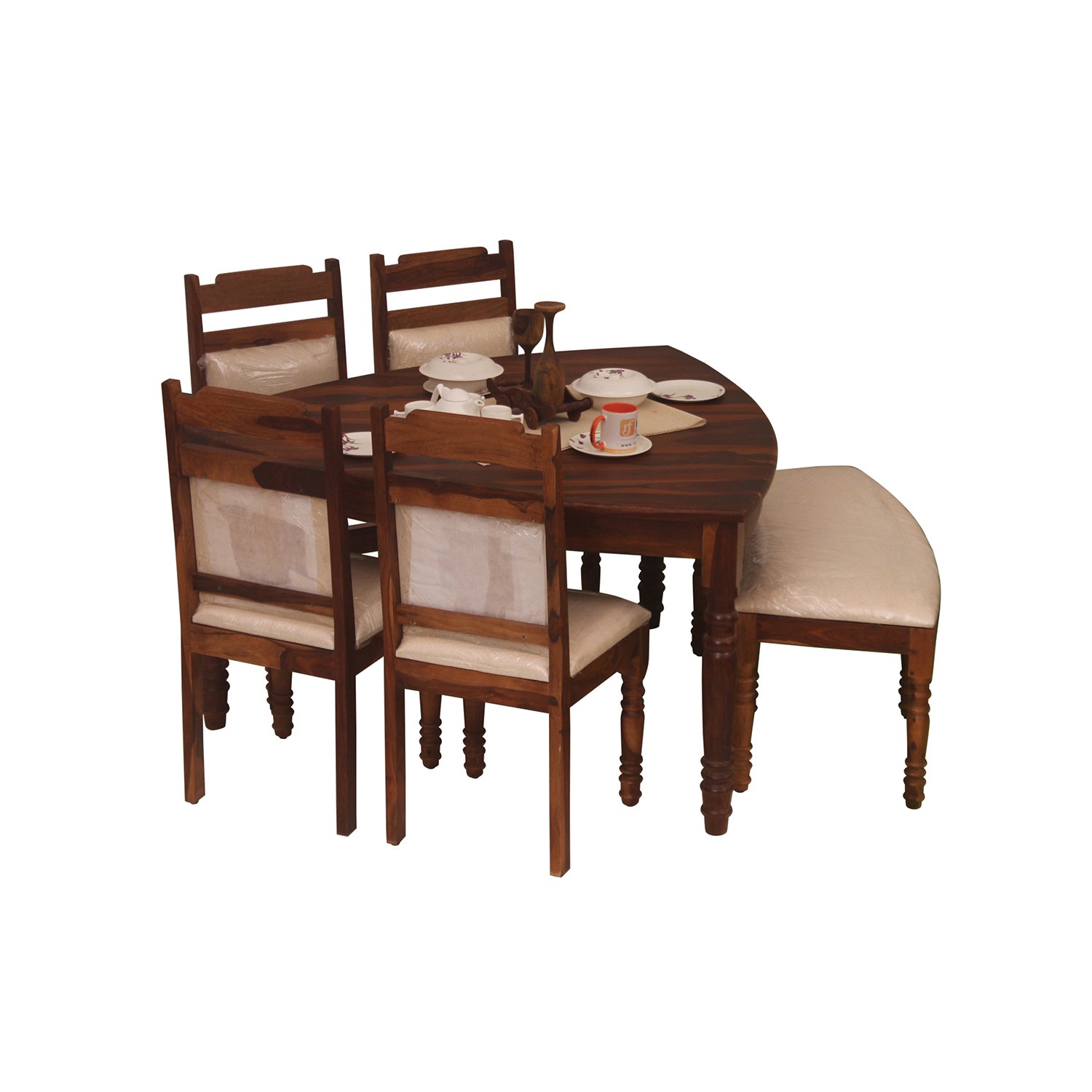 2. Material: The dining table and chairs are crafted from solid Sheesham wood, ensuring high-quality and durable furniture.